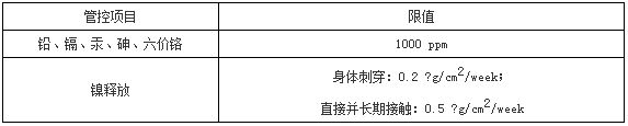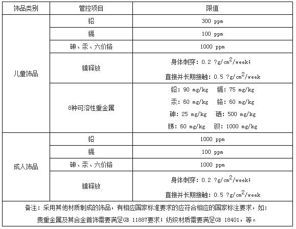 除了對普通金屬飾品有管控之外,我國對貴重金屬飾品中的有毒有害物質也有管控,如標準GB 11887-2008《首飾 貴金屬純度的規(guī)定及命名方法》。該標準規(guī)定了有害重金屬鉛、鎘、汞、砷、六價鉻及鎳釋放的限量要求。